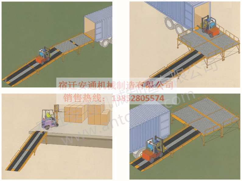 可拆式移動(dòng)登車(chē)橋是與叉車(chē)配合使用的貨物裝卸專用輔助設(shè)備。有了它,叉車(chē)能直接從地面駛?cè)肫?chē)車(chē)廂內(nèi)部進(jìn)行批量裝卸作業(yè)。產(chǎn)品采用人工絲桿調(diào)調(diào)節(jié),不需接動(dòng)力電源。只需單人操作,即可實(shí)現(xiàn)貨物的安全快速裝卸。它可使企業(yè)減少大量勞動(dòng)力,成倍提高裝卸作業(yè)效率,加快貨物流通速度,獲取更大經(jīng)濟(jì)效益。特別適用于作業(yè)場(chǎng)合受地方的限制,可以實(shí)現(xiàn)貨物的快速裝卸,并可以保證使用完后不占用場(chǎng)地。